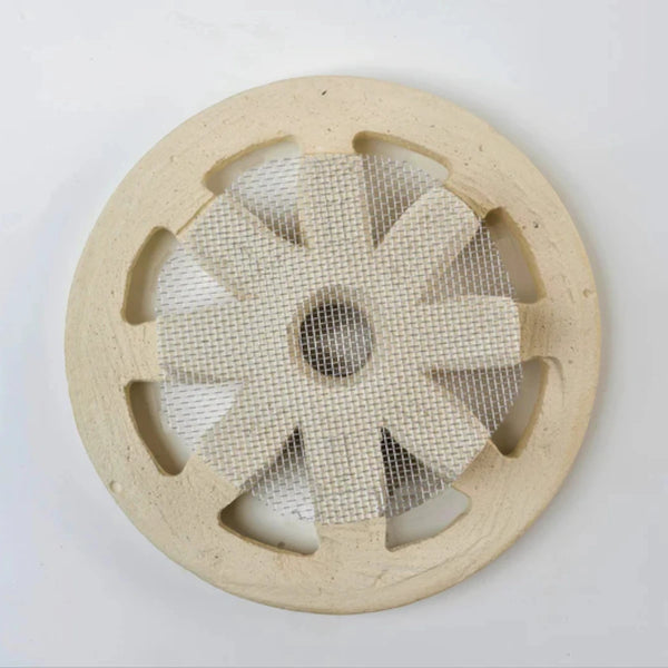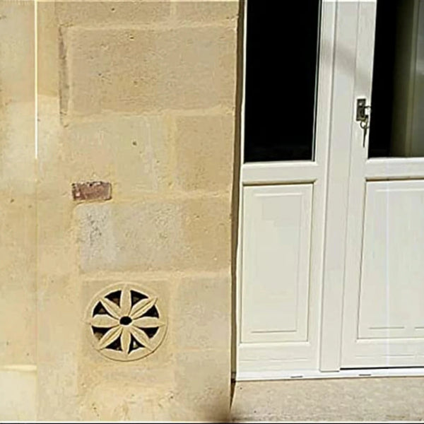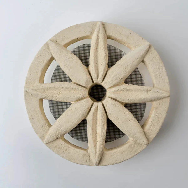 Griglia di aerazione e ventilazione tonda in pietra di Matera, per tubo diametro 100mm, uso esterno ed interno. Prodotto lavorato artigianalmente.