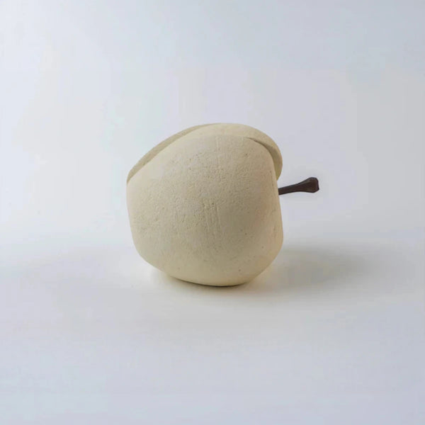 Ogni pezzo è scolpito singolarmente, esaltando la texture naturale del tufo: una pietra calcarea unica, porosa e calda, che rende ogni mela diversa e irripetibile. Piccole variazioni di superficie testimoniano la lavorazione artigianale e garantiscono l’originalità del prodotto.