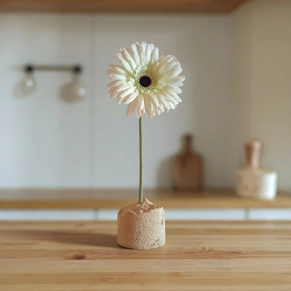 Il Portafiori di Tufa Italy nasce dall’idea di far fiorire la pietra. Un frammento di tufo di Matera, scavato e levigato a mano, diventa un piccolo custode di vita: una base solida che accoglie la leggerezza di un fiore.